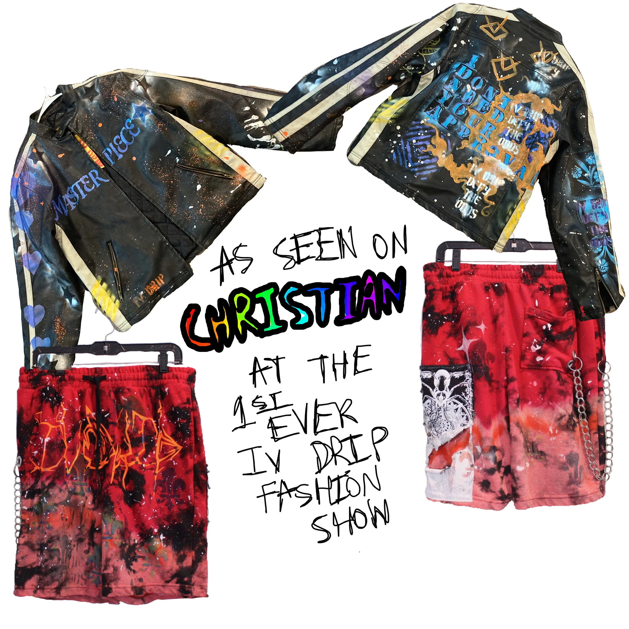 Photo by Nathan Lopez Model Christian Parson wearing the PUNK MASTERPIECE LEATHER JACKET and the RED LIGHTNING CHAIN SHORTS On stage at the Orange Peel in Asheville, NC