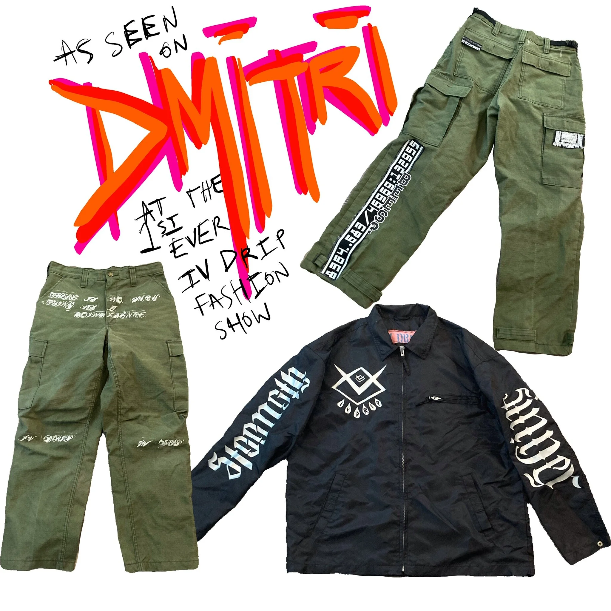 Photo by Nathan Lopez Model Dmitri Taylor wearing the FIREPROOF CARGO PANTS and the HIDDEN MESSAGES JACKET Makeup by Lindsey Smith On stage at the Orange Peel in Asheville, NC