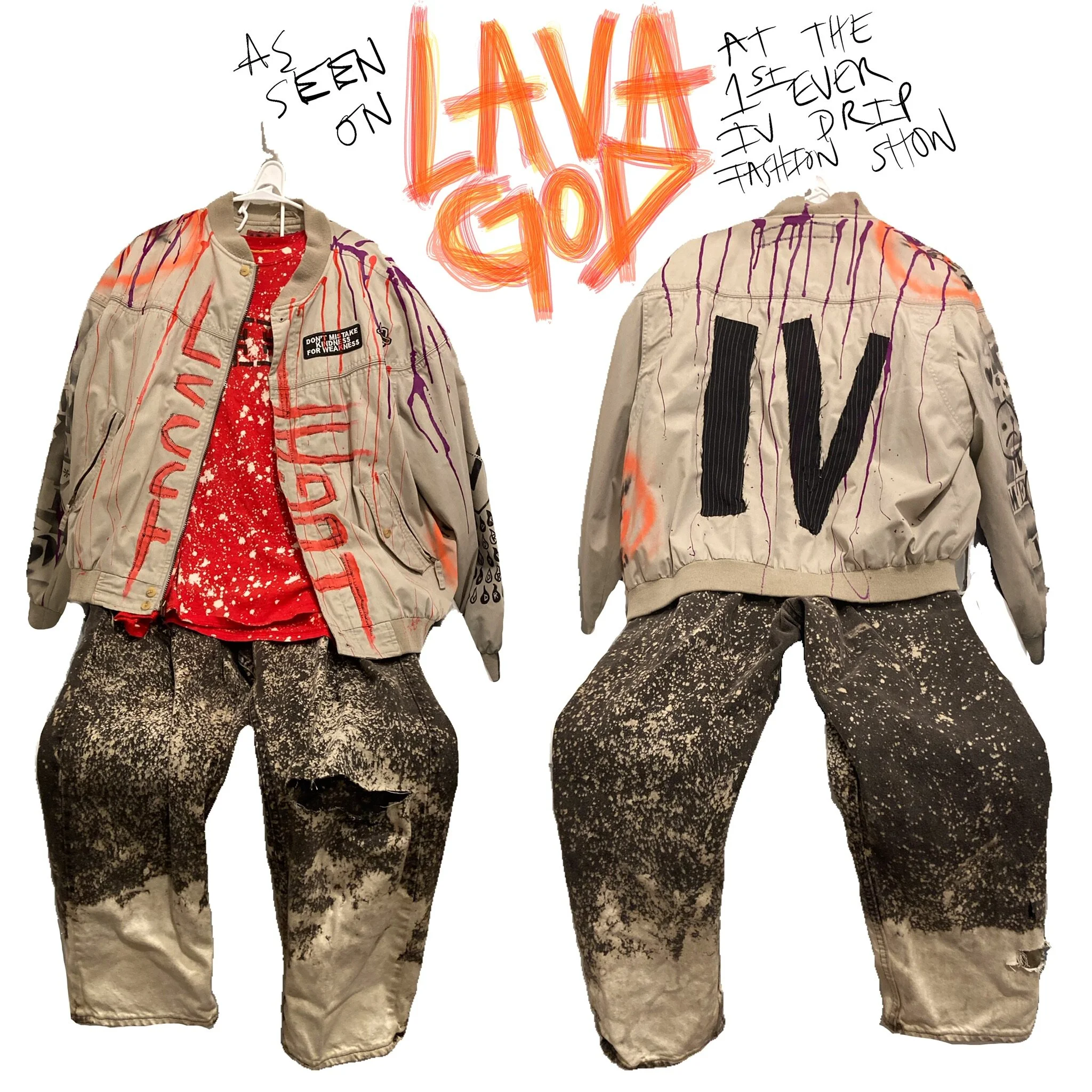 Photo by Nathan Lopez Model Fisher Sherrill AKA Lava God wearing the IDGAF JACKET and DENIM BLEACH CATASTROPHE JEANS Makeup by Samantha Olsen On stage at the Orange Peel in Asheville, NC